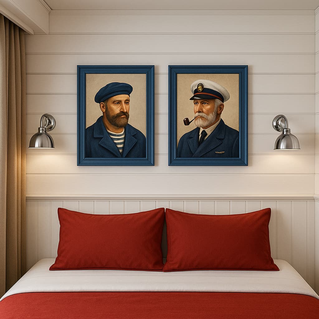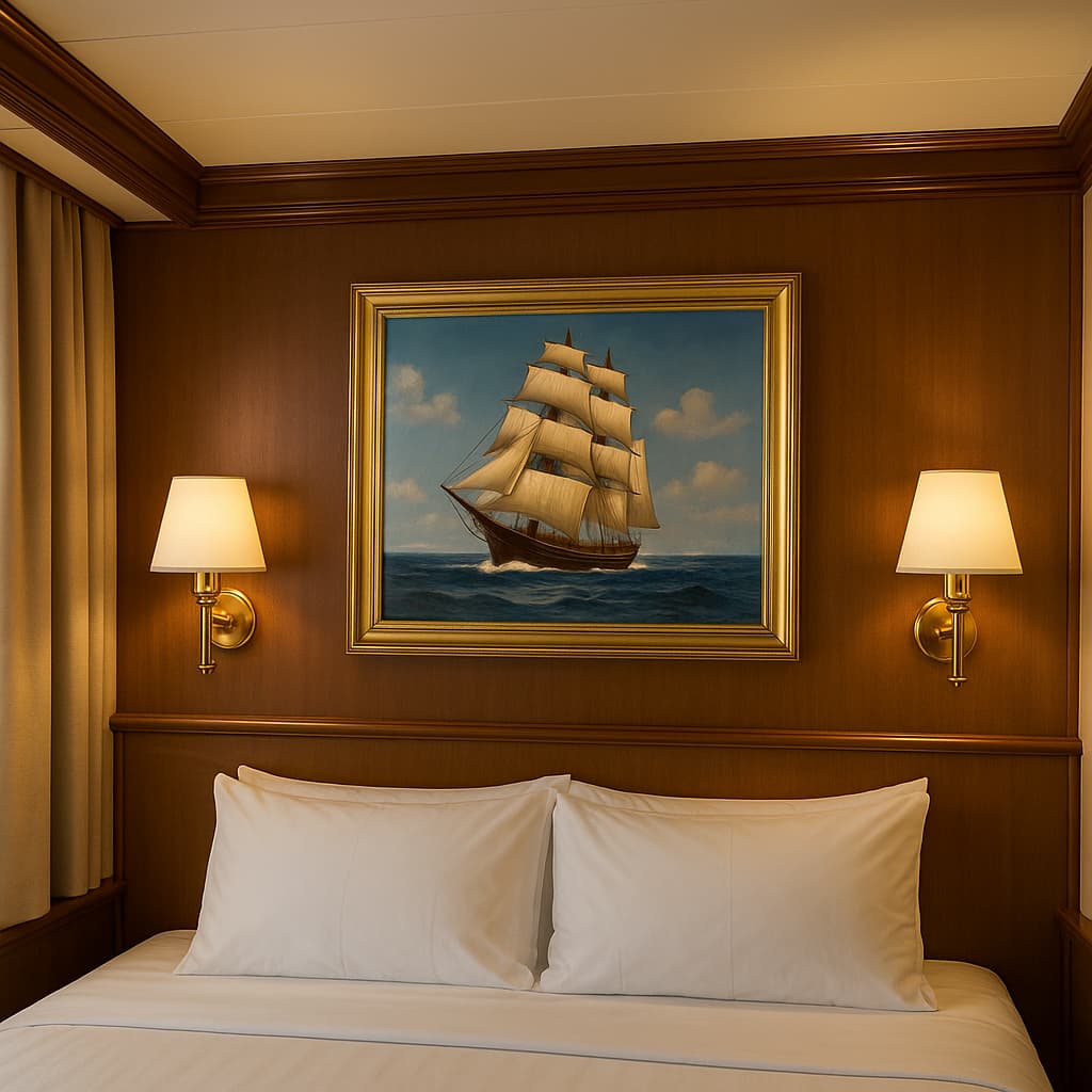 In nahezu jeder Kabine eines Kreuzfahrtschiffes – vom einfachen Innenraum bis zur Luxussuite – hängen gerahmte Bilder an den Wänden. Dabei handelt es sich häufig um maritime Motive wie Segelschiffe, Leuchttürme, Meereswellen oder auch abstrakte Drucke mit Bezug zum jeweiligen Fahrtgebiet. Doch die Rahmen bestehen meist aus leichten Materialien wie Aluminium, Kunststoff oder MDF, um Gewicht zu sparen und Verletzungsgefahren bei Seegang zu vermeiden. Glas wird aus Sicherheitsgründen häufig durch Acryl ersetzt. Die Bilder sind fest montiert und fügen sich harmonisch in das Farb- und Gestaltungskonzept der Kabine ein. Das bringt Kunst-Souveränität aufs Schiff, die den Sascha-Hehn-Stewardverschitt nur noch raunen lässt: „Dieser Rahmen hält mehr aus als der Kapitän nach dem Captain’s Dinner.“